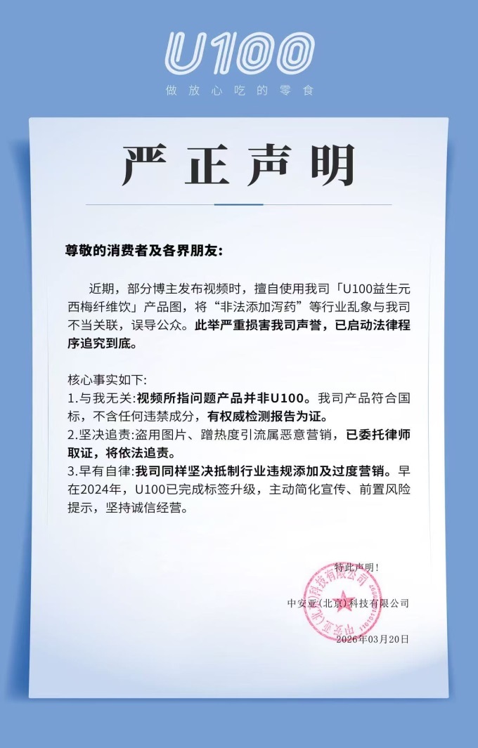 近日,有部分博主發(fā)布視頻時(shí),擅自使用「U100益生元西梅纖維飲」產(chǎn)品圖,將“非法添加瀉藥”等行業(yè)亂象與U100不當(dāng)關(guān)聯(lián),誤導(dǎo)公眾。