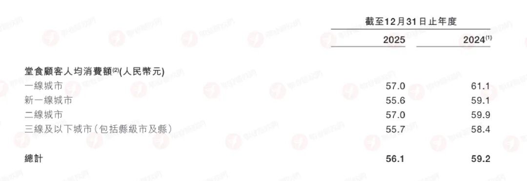 堅(jiān)守大眾餐飲的小菜園,更不例外。財(cái)報(bào)顯示,小菜園的堂食客單價(jià)延續(xù)了下滑趨勢(shì),從2024年的59.2元降至56.1元,降幅達(dá)5.2%。其中一線城市降幅最為顯著,從61.1元下降至57元,降幅高達(dá)4.1元,其余新一線、二線、三線及以下城市分別下滑3.5元、2.9元、2.4元。