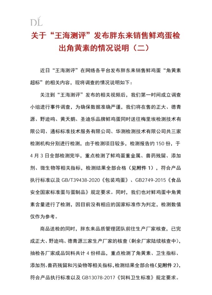 聯(lián)商快訊:4月5日,針對此前“王海測評”發(fā)布的胖東來鮮雞蛋“角黃素超標(biāo)”相關(guān)內(nèi)容,胖東來正式公布了全面調(diào)查與檢測結(jié)果(附有95頁相關(guān)檢測報告),明確將通過法律途徑維權(quán)。
