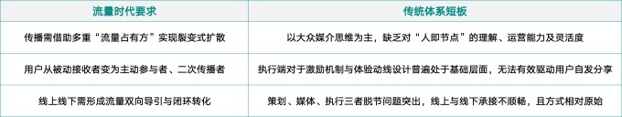 在筆者看來(lái),流量時(shí)代的核心特征可概括為三點(diǎn):傳播的去中心化、用戶行為的數(shù)據(jù)化、價(jià)值轉(zhuǎn)化的閉環(huán)化。由此反觀傳統(tǒng)體系,其“不適配”問(wèn)題便更為突出: