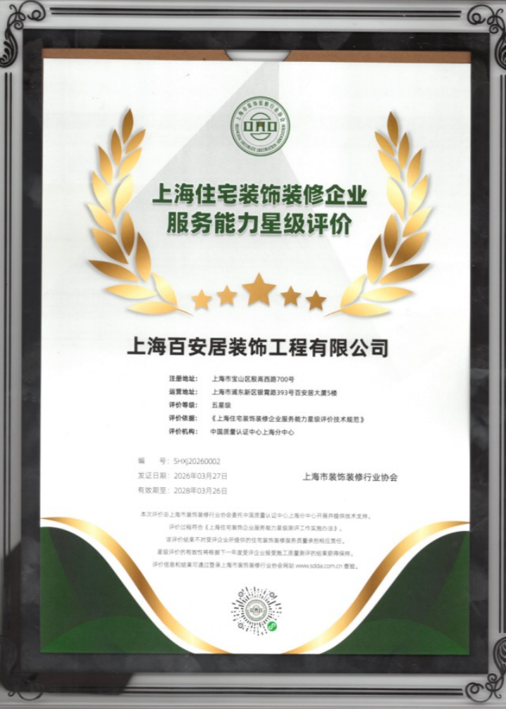 榮譽(yù)加冕,百安居榮膺上海住宅裝飾裝修企業(yè)服務(wù)能力五星認(rèn)證