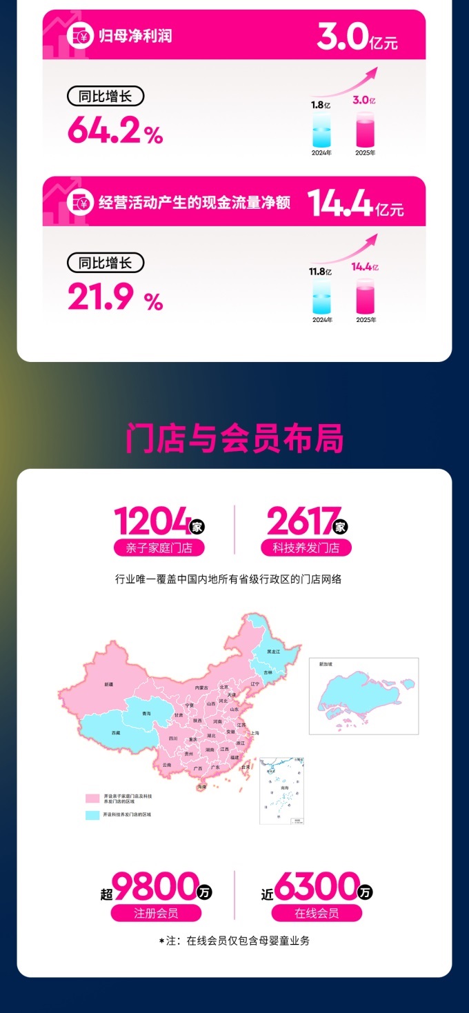 投資并購也為公司增添了新動(dòng)能。2025年,孩子王成功收購絲域生物。截至年末,絲域生物擁2617家頭皮及頭發(fā)護(hù)理門店。這次收購不僅豐富了“科技養(yǎng)發(fā)”這一新業(yè)態(tài),更與公司現(xiàn)有會員運(yùn)營、市場布局、渠道共享形成顯著協(xié)同效應(yīng)。與此同時(shí),孩子王持續(xù)深化與樂友國際的融合,優(yōu)化雙品牌運(yùn)營機(jī)制,釋放1+1>2的整合效能。