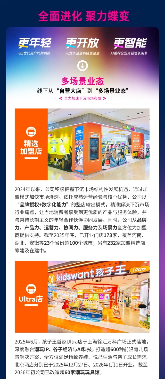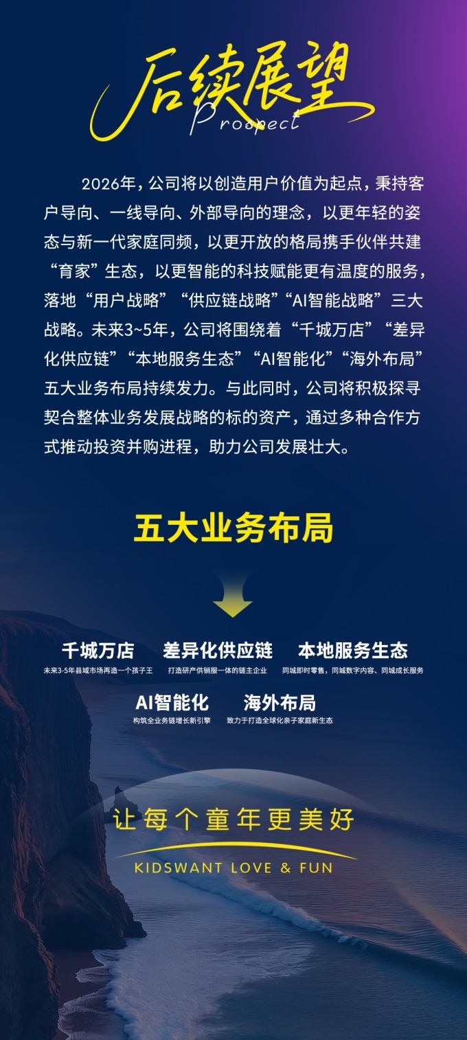 面向2026年,孩子王正圍繞六大方向穩(wěn)步推進(jìn)戰(zhàn)略落地。持續(xù)升級和擴(kuò)展門店網(wǎng)絡(luò),加速“千城萬店”戰(zhàn)略布局;深化用戶運(yùn)營體系升級,賦能用戶體驗(yàn)與單客價(jià)值增長;持續(xù)深化自有品牌戰(zhàn)略,打造研產(chǎn)供銷服一體化供應(yīng)鏈鏈主企業(yè);大力推進(jìn)同城業(yè)務(wù)發(fā)展,創(chuàng)建同城親子家庭服務(wù)首選入口;全面推進(jìn)人工智能化應(yīng)用,構(gòu)筑全業(yè)務(wù)鏈增長新引擎;深化全球化戰(zhàn)略布局,重點(diǎn)聚焦東南亞市場,加快構(gòu)建具有國際影響力的親子家庭服務(wù)品牌。