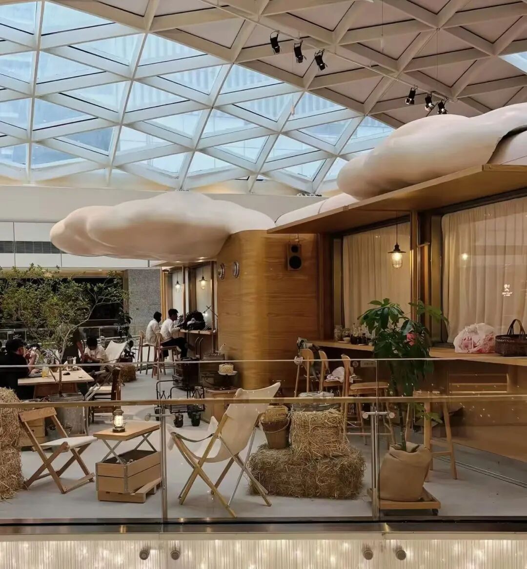 屋頂懸掛著形似打發(fā)奶油的“白云”,整間門店宛如一列云朵列車。店外擺放著干草垛、露營椅,并設有外擺堂食區(qū),非常適合顧客拍照打卡。
