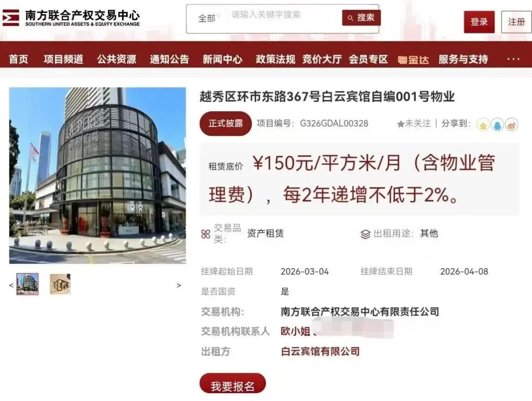 有信息顯示,越秀區(qū)環(huán)市東路367號白云賓館自編001號物業(yè),正在整體招租,封面圖用的正是麗柏廣場。