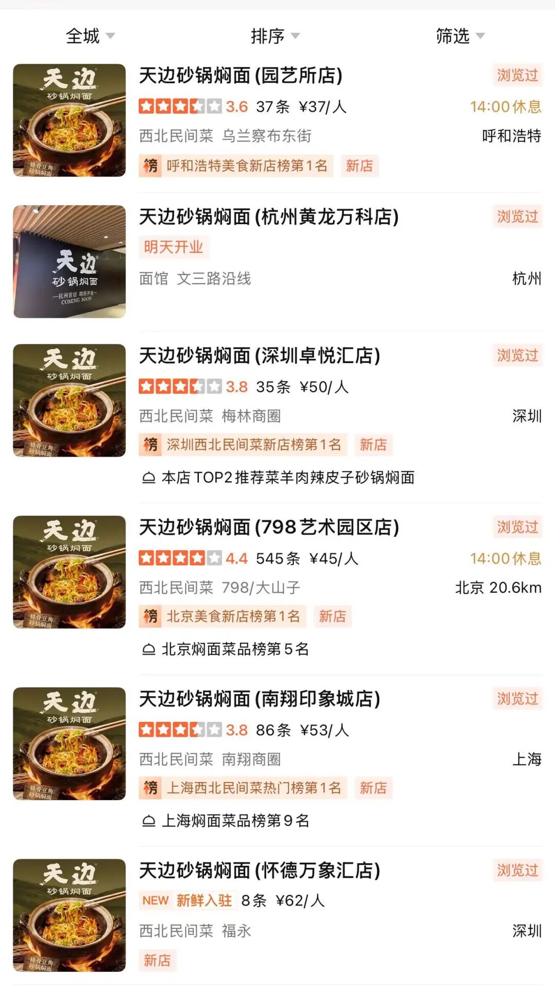 近期,西貝副牌“天邊砂鍋燜面”密集拓新店,陸續(xù)在北京、呼和浩特、上海、深圳開出5家門店,大眾點評顯示,全國第六店(杭州黃龍萬科店)預計在4月6日開業(yè)。