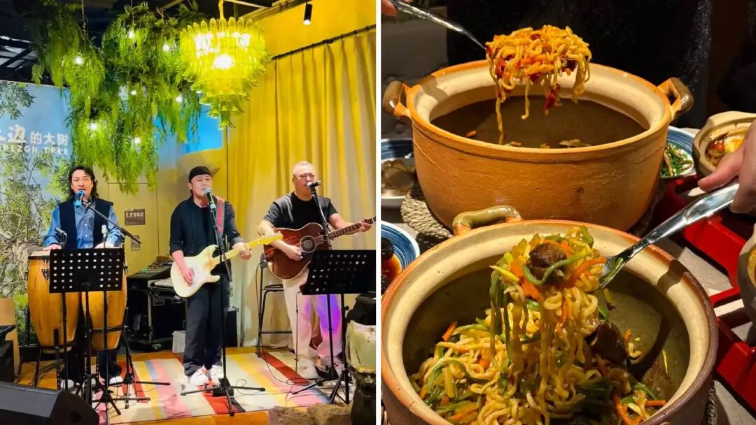 和以往的副牌不同,天邊砂鍋燜面是徹徹底底的“去賈國龍化”。品牌名字和LOGO里再沒有賈國龍或西貝的標識,裝修風格也拋掉了高辨識度的“紅格子桌布”,而是采用了迎合當前消費風向的“粗糲山野風”,甚至還邀請了河套當?shù)氐膿u滾樂隊駐場。