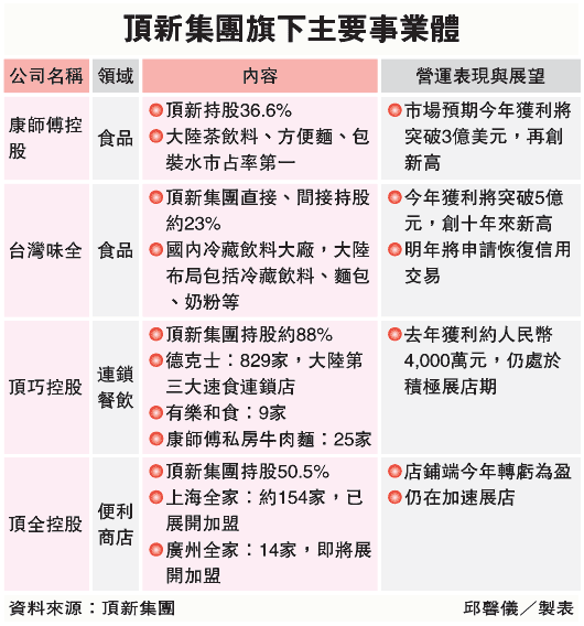 除了臺(tái)灣味全外,頂新集團(tuán)在臺(tái)灣的糧油事業(yè)規(guī)模不小,伊藤忠又是國(guó)際重要的大宗物資貿(mào)易商之一,糧油事業(yè)也是雙方可能合作的項(xiàng)目。
