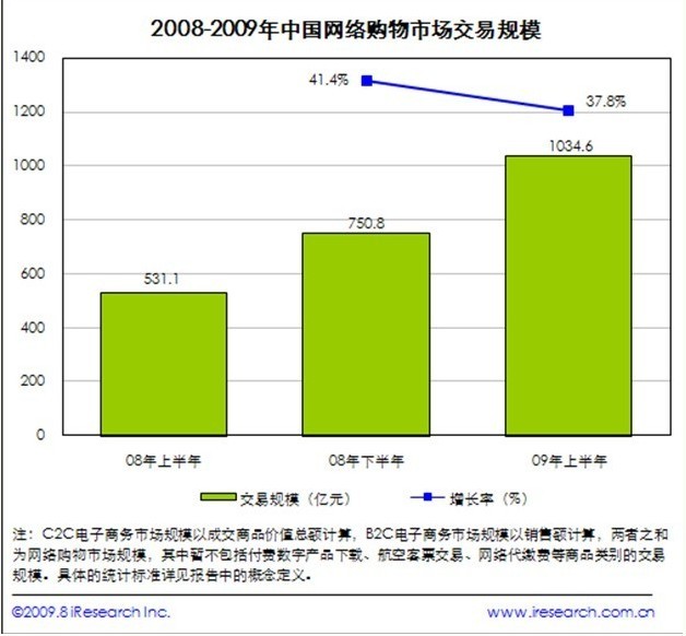 艾瑞咨詢《2009年上半年中國網(wǎng)絡(luò)購物市場發(fā)展報告》數(shù)據(jù)顯示,2009年上半年中國網(wǎng)絡(luò)購物市場規(guī)模突破千億元,達(dá)到1034.6億,同比08上半年的531.1億元高速增長94.8%,環(huán)比08下半年增長37.8%。