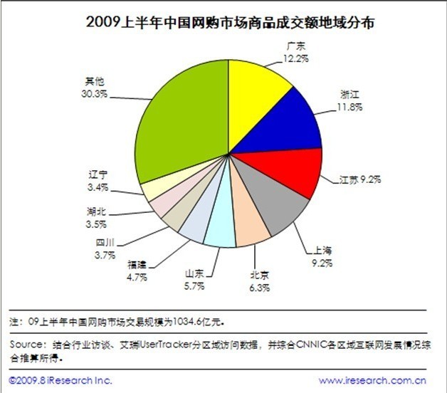 艾瑞咨詢對09上半年網(wǎng)購市場覆蓋區(qū)域的統(tǒng)計數(shù)據(jù)顯示, 代表主流消費群體的經(jīng)濟(jì)發(fā)達(dá)地區(qū)同時也占據(jù)著網(wǎng)購市場的主要份額,其中,廣東、浙江、江蘇分別以12.2%、11.8%和9.2%的份額排名前三。而網(wǎng)購對我國主流消費群體覆蓋度的增強,預(yù)示著中國網(wǎng)購市場的社會經(jīng)濟(jì)地位將會進(jìn)一步提升。
