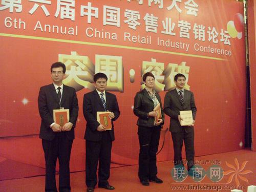 2009中國零售業(yè)青年英才頒獎現(xiàn)場,河北國大總經(jīng)理于樹中(左一)、西安民生總裁馬超(右一)等人獲獎