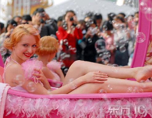 杭州一商場(chǎng)上演“金發(fā)美女”街頭浴缸秀