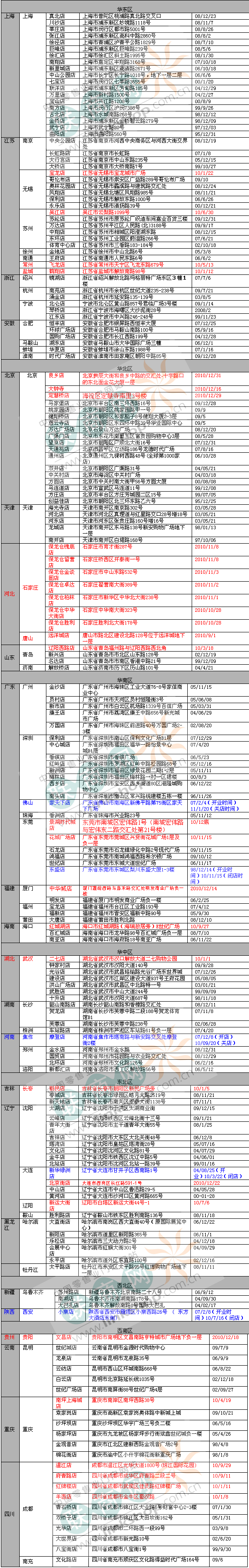 。ㄗⅲ浩渲屑t色字體部分為2010年新開門店30家,藍(lán)色為已關(guān)閉或即將關(guān)閉門店共5家)