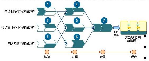 從傳統(tǒng)制造商、傳統(tǒng)商業(yè)企業(yè)、網(wǎng)絡(luò)零售商開展的大規(guī)模渠道連鎖努力,將逐步應(yīng)用這7種大規(guī)模渠道連鎖模式,也將會遵循一定的規(guī)律、沿著一定的路徑逐步演進,依托“起始-過程-發(fā)展-現(xiàn)代”的次序,最終成長為一種新模式,即大規(guī)模協(xié)同銷售模式。