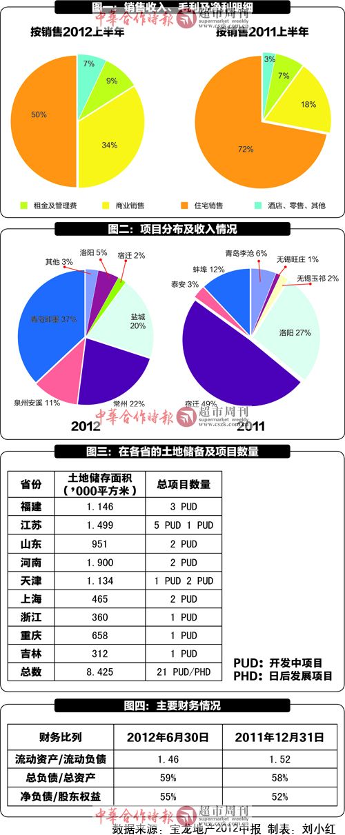 寶龍地產(chǎn)2012年中期業(yè)績顯示:營業(yè)額28億元,較去年同期增長43%;凈利潤總額12.3億元,其中租金及管理費收入為2.41億元,比去年同期增長70%,土地儲備842萬平方米。