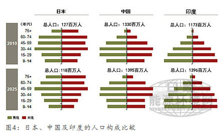 不過,即便如此,印度市場(chǎng)依然受到了全球眾多企業(yè)的關(guān)注,最大的原因或許就在于其人口規(guī)模、增長(zhǎng)率以及年輕人較多的人口構(gòu)成。在今后20年內(nèi),印度人口會(huì)持續(xù)增長(zhǎng),而且年輕人口及勞動(dòng)人口會(huì)也持續(xù)增加,其旺盛的消費(fèi)將推動(dòng)市場(chǎng)的發(fā)展。從下圖也可以看出,印度與日本和中國(guó)的人口構(gòu)成不同,據(jù)推測(cè)到2025年,總?cè)丝趯⒊^中國(guó)。