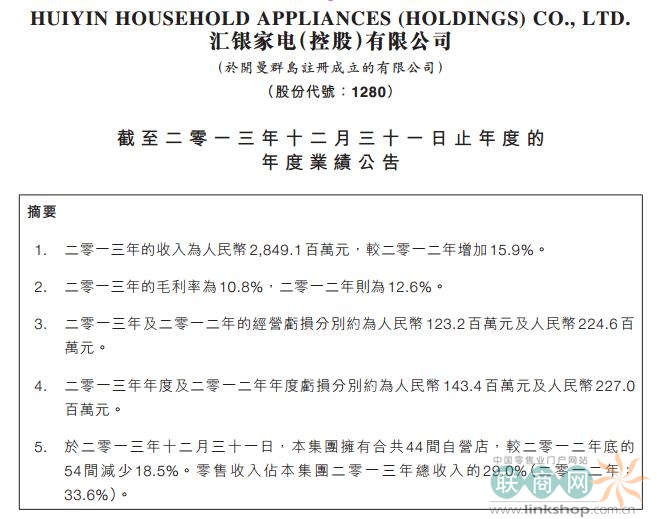 聯(lián)商網(wǎng)消息:匯銀家電日前發(fā)布2013年業(yè)績(jī)公告,公告顯示,2013年的收入為人民幣28.49億元,較2012年增加15.9%。2013年度的毛利率為10.8%,2012則為12.6%。2013和2012年的經(jīng)營(yíng)虧損分別約為人民幣1.232億元及人民幣2.246億元。2013年度和2012年度虧損分別約為人民幣1.434億元及人民幣2.27億。截止2013年12月31日,集團(tuán)擁有合共44 間自營(yíng)店,較2012年底的54間減少18.5%。零售收入占集團(tuán)2013總收入的29.0%(2012年為: 33.6%)。