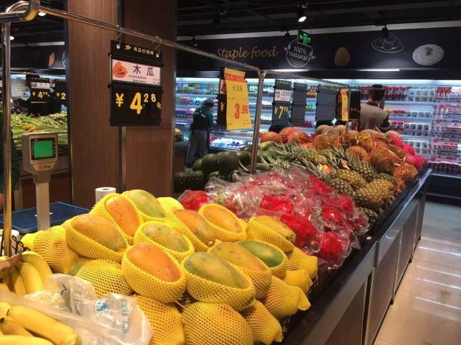 據(jù)悉,Sofly首航南庭新苑店位于社區(qū)服務(wù)中心的二層,營業(yè)面積不到1200平,現(xiàn)經(jīng)營單品8000余種,該店定位生鮮加強型社區(qū)食品超市,生鮮經(jīng)營面積占比高達60%。賣場通過電梯的設(shè)置精妙布局了顧客出入口,根據(jù)狹長的建筑結(jié)構(gòu),因勢利導把生鮮區(qū)、百貨區(qū)、食品區(qū)、收銀區(qū)進行了科學布局,保證動線合理的同時也方便了顧客的購物需要。