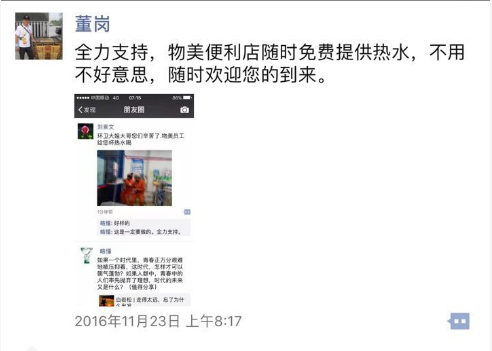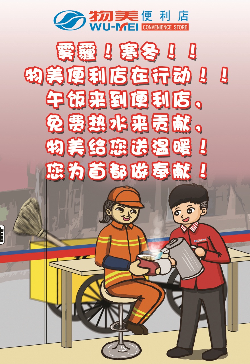 而北京物美便利店總經(jīng)理董崗在11月23日的微信朋友圈中寫道“全力支持,物美便利店隨時(shí)免費(fèi)提供熱水,不用不好意思,隨時(shí)歡迎您到來(lái)”,聯(lián)商網(wǎng)記者了解到,進(jìn)入寒冬遍布城區(qū)的每家物美便利店都在為環(huán)衛(wèi)工人提供熱水和微波爐加熱服務(wù)。