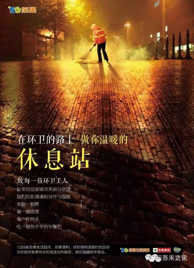 南京市內(nèi)外1289家蘇果生活超市、蘇果便利、“好的”門店,全部為每一位環(huán)衛(wèi)師傅免費(fèi)提供熱水,免費(fèi)提供微波加熱,提供吧臺(tái)休息。讓勞累一天的他們,喝上一口熱水,吃上熱氣騰騰的飯菜。