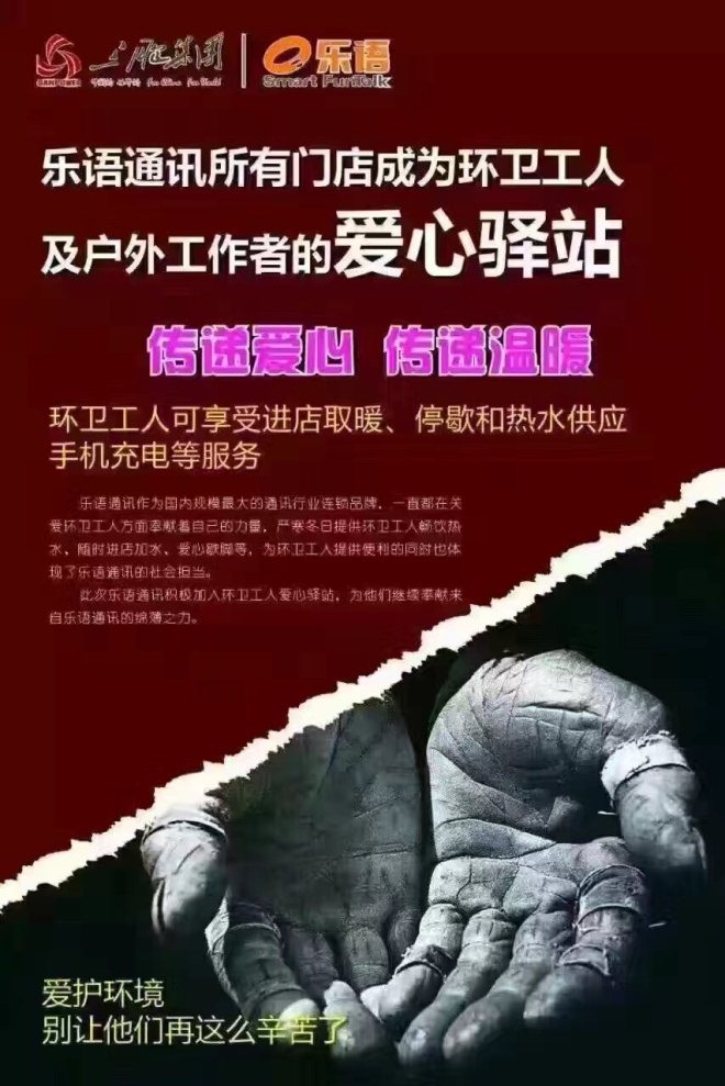 樂語(yǔ)通訊總裁朱偉告訴聯(lián)商網(wǎng)記者,樂語(yǔ)通訊從去年開始就做這樣的溫暖行動(dòng)了,所有門店都將成為環(huán)衛(wèi)工人及戶外工作者的愛心驛站。