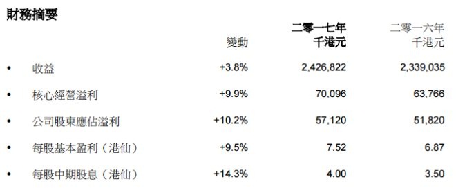 整體而言,公司核心經營溢利增加9.9%至7009萬港元(約合5985萬人民幣)。截至2017年6月30日止六個月,純利增加10.2%至5712萬港元(約合4877萬人民幣)。