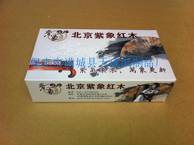 保定市滿城縣天成紙制品廠(電話:13383123763),我廠專業(yè)定做廣告盒抽紙,廣告軟抽紙,禮品盒抽紙,禮品軟抽紙,企業(yè)專用盒抽紙、軟抽紙,銀行專用盒抽紙、軟抽紙,促銷專用盒抽紙、軟抽紙。我們擁有成套生產(chǎn)制造設(shè)備、成熟先進(jìn)的的加工工藝,執(zhí)行嚴(yán)格的品質(zhì)管理流程,具有良好的創(chuàng)新開發(fā)能力。經(jīng)過多年的發(fā)展,積累了豐富的實(shí)際生產(chǎn)經(jīng)驗(yàn),交貨快捷,質(zhì)量穩(wěn)定。 我公司產(chǎn)品均以純木漿為原料,紙質(zhì)柔韌、潔白、不掉紙屑,潔凈衛(wèi)生,歡迎新老客戶洽談合作。