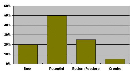 中間那組數(shù)千人數(shù)的顧客通常有潛力成為良好顧客雖然并不是最佳的,我們的任務(wù)是使他們成為最好的20%中的一部分。可以通過這種方式來達(dá)到這個目標(biāo):向他們詢問什么是最重要的,然后制定能夠增加這群顧客消費的可行性戰(zhàn)略。這通常要求良好的商店銷售技巧,以及令人滿意的花色品種、門面再加上品牌。戰(zhàn)勝這組人的關(guān)鍵在于了解什么可以取悅他們,同時要保證這樣做不會疏遠(yuǎn)你的最佳顧客。
