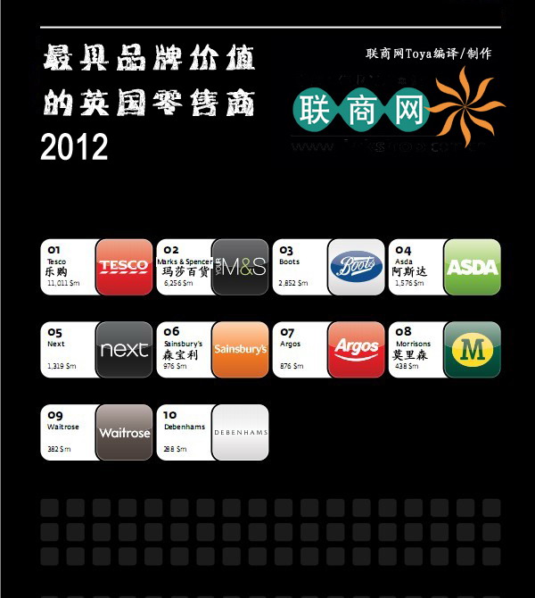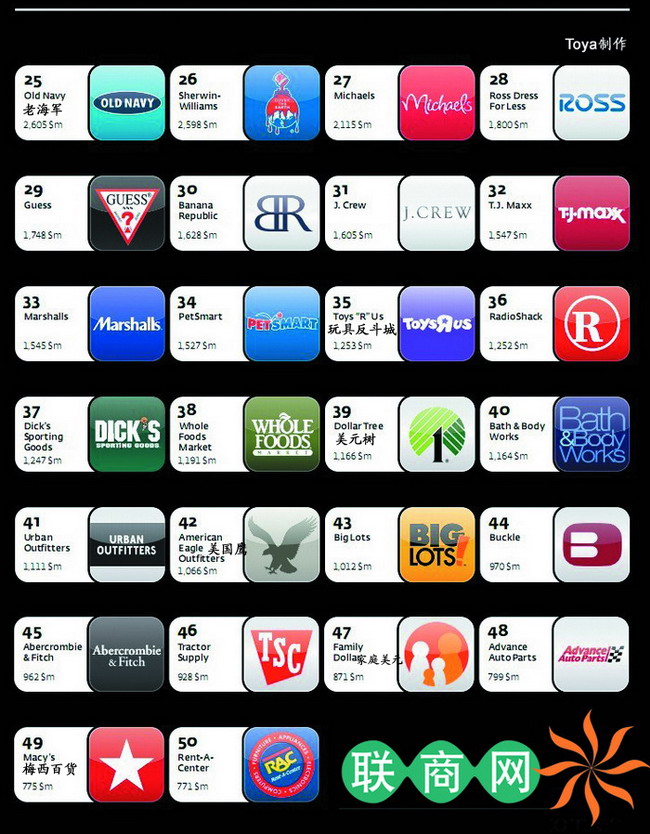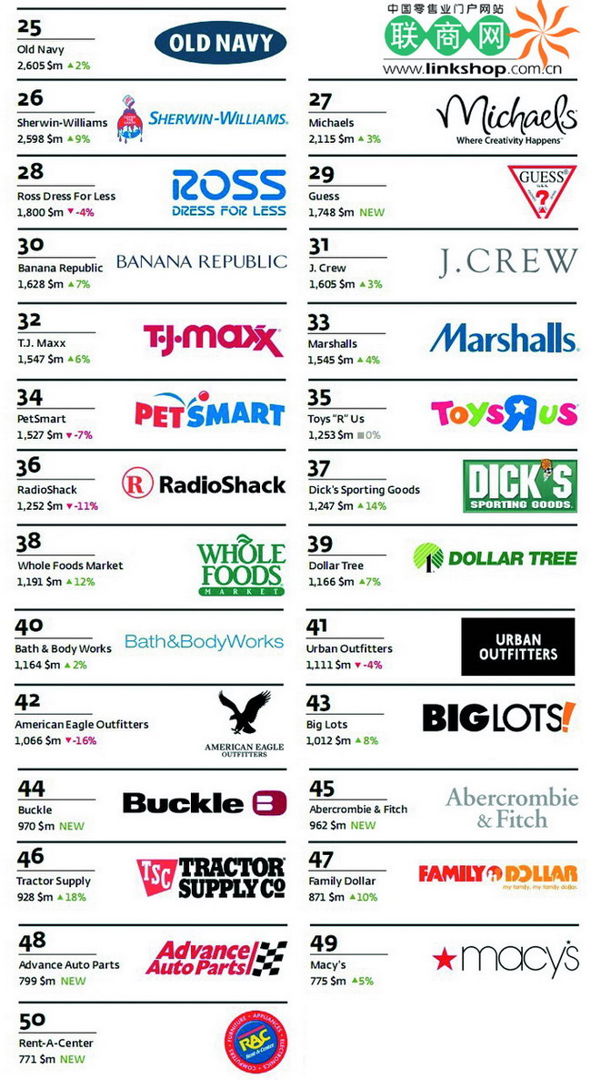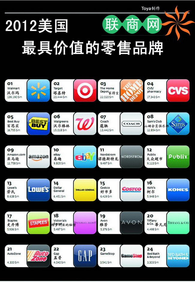 美國品牌顧問公司Interbrand發(fā)布的2012美國最具價值的零售品牌50強榜單。