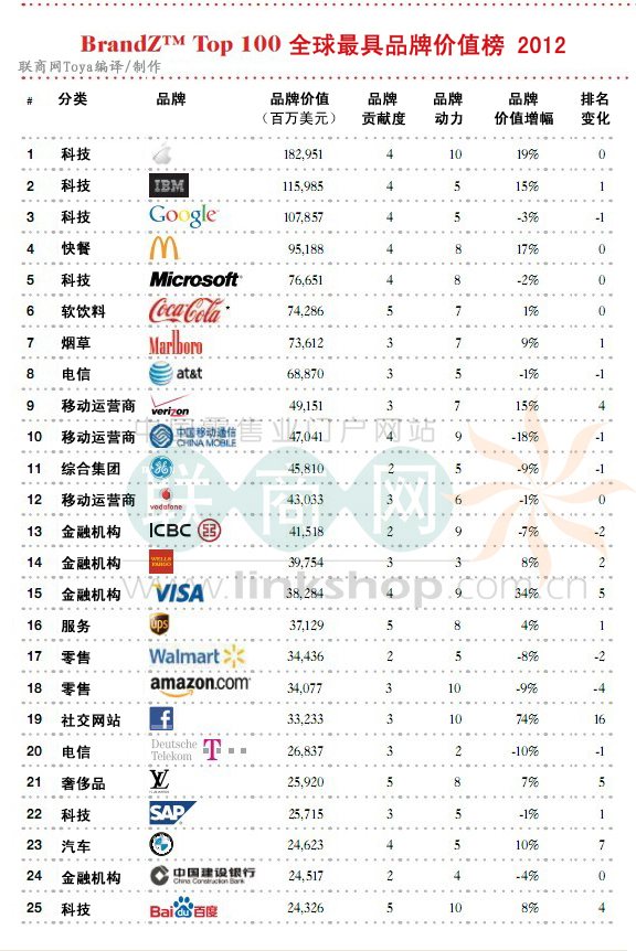 專業(yè)市場調(diào)查機構(gòu)Millward Brown發(fā)布的2012年BrandZ最具價值全球品牌榜TOP100報告。