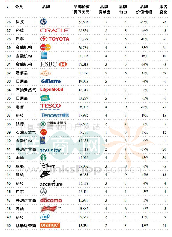 中國品牌入圍的有13家,分別是:中國移動(10),中國工商銀行(13),中國建設(shè)銀行(24),百度(25),騰訊(37),中國農(nóng)業(yè)銀行(43),中國人壽(53),中石化(56),中國銀行(61),中石油(68),茅臺(69),平安保險(78),中國電信(90)。 很遺憾沒有零售相關(guān)企業(yè)。