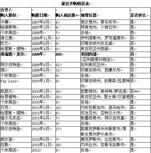 自從1999年與弗瑞德·麥爾合并以來,克羅格已經(jīng)購入了200多家商鋪?肆_格的購股策略主要聚焦在現(xiàn)存的市場。從現(xiàn)有市場里找尋契機購股,風險更低,而且通常情況下回報率較高,因為這樣的購股所需要的用于企業(yè)一般管理、廣告宣傳和銷售上的投資較少。