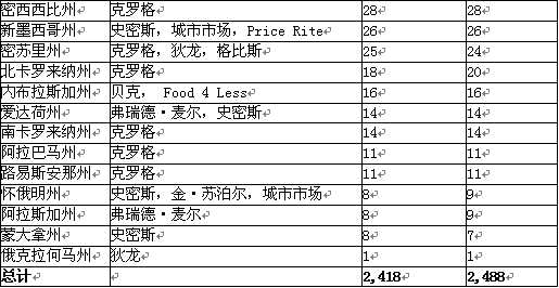 帶*的表示克羅格公司已并購這些商店,但不一定全權由克羅格管理。帶**的表示這些商店被重新改造后正轉(zhuǎn)變到克羅格旗下。