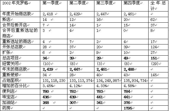 前言   本報(bào)告列舉了關(guān)于克羅格公司未來發(fā)展演變的一些頗有遠(yuǎn)見的論述。這些論述以管理假設(shè)論和信心論為基礎(chǔ),并立足于目前所能搜集到的信息,論點(diǎn)之間彼此聯(lián)系,同中有異,都提到了如下問題:預(yù)計(jì)的每股收益簡(jiǎn)稱“EPS”)的長(zhǎng)勢(shì),營(yíng)利資本的減少,我們創(chuàng)造現(xiàn)金流的能力,我們的戰(zhàn)略性成長(zhǎng)計(jì)劃(簡(jiǎn)稱“計(jì)劃”),并用了如“舒適的”,“忠實(shí)的”,“期待”,“目的”,“目標(biāo)”等相關(guān)詞匯或詞組來加以說明。這些論述雖可謂高瞻遠(yuǎn)矚,但受不確定因素和其他因素的影響,故而可能與今后的實(shí)際情況大相徑庭。   本報(bào)告中其他涉及我們的期望,預(yù)測(cè),信仰,意圖或決策的論述與1934年出臺(tái)的有價(jià)證券交易條例21章E部分的涵義一致,可謂是長(zhǎng)足之見。但是我們盡管相信這些論述是準(zhǔn)確的,總體經(jīng)濟(jì)的不確定性,我們的勞動(dòng)力關(guān)系,我們將計(jì)劃及時(shí)付諸實(shí)施的能力以及下面將提到的其他各種不確定因素都可能使得以后的實(shí)際情況與我們的論述背道而馳。   2001年11月,我公司制訂了計(jì)劃,支持對(duì)核心行業(yè)的額外投資,以增加銷售額,提高市場(chǎng)份額。該計(jì)劃有三個(gè)要領(lǐng):減少操作費(fèi)用,一般支出和行政管理費(fèi)用(以下簡(jiǎn)稱OG&A),相應(yīng)地增加廣告推銷和采購活動(dòng)的支出,并以降低零售價(jià)格為指標(biāo)。2003年2月1日,我們已經(jīng)降低了3.06億美元的成本。2002年,我們按照計(jì)劃的指標(biāo),精減了將近1500個(gè)管理人員和書記員,同時(shí)把納什維爾的地方辦事處和配給中心跟亞特蘭大和中南部地區(qū)的作了合并。我們期待著,在2003財(cái)政年底,可以突破原定的降低成本5億美元的目標(biāo)。   2002年,我們的同類食品商店銷售額情況,包括超級(jí)市場(chǎng)燃料中心,比起2001年來沒有發(fā)生變化。我們認(rèn)為2002年疲軟的經(jīng)濟(jì)態(tài)勢(shì)和日益增長(zhǎng)的競(jìng)爭(zhēng)一定程度上抵銷了本公司按既定計(jì)劃降價(jià)所帶來的影響。   2003年2月1日,該計(jì)劃花費(fèi)的整改費(fèi)用總額達(dá)到近5200萬美元,主要用于支付裁員所需的安置費(fèi),整合配給中心和公司轉(zhuǎn)型。我們相信繼續(xù)推行這一計(jì)劃將提高我們的競(jìng)爭(zhēng)地位。同時(shí),我們已經(jīng)發(fā)掘了降低成本和更有效營(yíng)運(yùn)的額外時(shí)機(jī)。例如,2003年3月,我們宣布將總部分別設(shè)在密歇根州利沃尼亞市和俄亥俄州哥倫布市的兩個(gè)零售部門合并。   2003年,我們估計(jì)每股收益將達(dá)到1.63美元。這個(gè)預(yù)測(cè)包括了每股約0.02美元的用于系統(tǒng)改進(jìn)的耗費(fèi),以及密歇根州和哥倫布市各部門合并時(shí)的費(fèi)用,還包括養(yǎng)老退休金和衛(wèi)生保健方面支出的增長(zhǎng)部分。由于目前還不能估計(jì)過剩能量購股帶來的點(diǎn)對(duì)市場(chǎng)的影響將如何,故2003年每股收益暫不考慮該影響。我們期待同類食品商店的銷售態(tài)勢(shì),包括燃料,在2003年將會(huì)是積極的。這些預(yù)測(cè)首先假設(shè)通貨膨脹率維持不變,經(jīng)濟(jì)水平和競(jìng)爭(zhēng)的環(huán)境也保持不變。目前,我們并沒有逾越2003這一財(cái)政年的實(shí)際情況而指導(dǎo)銷售或收入。   基于目前的利率環(huán)境,我們預(yù)測(cè)2003年的利息支出將達(dá)到近5.75億到5.95億美元,此外,在2003年,折舊費(fèi)用將達(dá)到近11.75億到12億美元,OG&A 費(fèi)用率將增加約40到50個(gè)基本點(diǎn),我們的毛利潤(rùn)率,除去LIFO的影響,將增加近20到30個(gè)基點(diǎn)。2003年LIFO費(fèi)用預(yù)計(jì)將近3500萬美元。 1999年第3季度,我們制定了目標(biāo),即在2004年第3季度末前降低5億美元營(yíng)運(yùn)資本凈額。在此,營(yíng)運(yùn)資本凈額是指LIFO信貸下的流動(dòng)營(yíng)業(yè)資產(chǎn),減去流動(dòng)營(yíng)業(yè)負(fù)債所得的金額。因此,我們歷史地再現(xiàn)了近年來上述定義下的營(yíng)運(yùn)資本凈額。2003年1月22日,SEC簽發(fā)了33-8176號(hào)讓渡公文,提出了關(guān)于揭露非GAAP金融措施的新要求。讓渡公文允許某些非GAAP的金融措施上臺(tái),只要這些措施服從于直接可比的GAAP金融措施,而不發(fā)生抵觸。我們視公布營(yíng)運(yùn)資本額為評(píng)估我們營(yíng)運(yùn)資金操作情況的一個(gè)重要手段,是突破1999年制定的舊的目標(biāo),獲得管理措施上的進(jìn)步的基礎(chǔ),因而我們將繼續(xù)公布營(yíng)運(yùn)資本凈額。然而,為與33-8176號(hào)讓渡公文相一致,今后所有營(yíng)運(yùn)資本凈額的公布都將采用人們更普遍認(rèn)可的定義,即營(yíng)運(yùn)資金等于流動(dòng)資產(chǎn)減去流動(dòng)負(fù)債。我們并不希望只在公布營(yíng)運(yùn)資本凈額和執(zhí)行其他任何被普遍接受的會(huì)計(jì)原則措施之間二選一。    2002年底,營(yíng)運(yùn)資本比2001年底減少了6900萬美元,比2000年底減少了7200萬美元, 比較營(yíng)運(yùn)資本凈額比2001年底減少了1.93億美元,比2000年底減少了5000萬美元。我們期待在2003年中將營(yíng)運(yùn)資本凈額再降低1億。下表顯示了2000年末、2001年