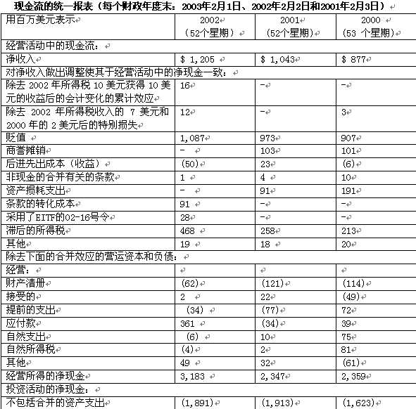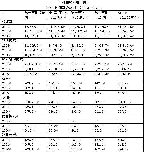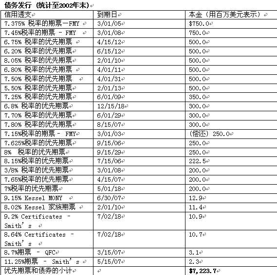 到期債務(wù)   克羅格財(cái)務(wù)戰(zhàn)略計(jì)劃的主要目標(biāo)是贏得達(dá)到BBB/Baa2的存款等級(jí)。我們相信BBB/Baa2的存款等級(jí)會(huì)給公司的長期債務(wù)、商業(yè)票據(jù)市場帶來最大的機(jī)動(dòng)性,而且會(huì)降低資產(chǎn)的成本?肆_格近期的負(fù)債率如下所示: Fitch BBB Moody’s Baa3 積極前景 S&P BBB- 積極前景   財(cái)務(wù)目標(biāo):   1.達(dá)到財(cái)務(wù)目標(biāo)與BBB/Baa2的存款等級(jí)看齊。   2.降低凈營運(yùn)資本。2004年第三個(gè)季度的凈營運(yùn)資本與1999年同期的比能降低50000萬美元。   3. 平衡到期債務(wù).   4. 維持強(qiáng)勢的資金計(jì)劃。   5.用大約三分之一的現(xiàn)金流償還債務(wù),然后用剩下的三分之二重新購買股票或者分配紅利。在2003年上半年,克羅格完成了以下的財(cái)務(wù)事務(wù): 在1月發(fā)行了50000萬美元5.5%利息的債券,到2013年2月1日到期。隨后: 在2月28日,因?yàn)樽赓U期滿,購買了20200萬美元的所有權(quán),有效期16年。 在3月1日,到期兌換了Fred Meyer 7.15%利息的25000萬美元的債券。 選擇性的提前償還了2007年到期的Quality Food Centers公司8.7%利息的從屬債券310萬美元 在2003年5月21日,完成了364天周期的同業(yè)信用透支高達(dá)10億美元的償還和重新透支。由于公司良好的現(xiàn)金流動(dòng)克羅格公司的透支額下降了25000萬美元?肆_格有主要的三大同業(yè)信用透支: 2004年5月19日到期的10億美元的364天周期的信用透支。 如果克羅格不延期或者不提前償還的話,有價(jià)值81250萬美元的5年期信用協(xié)議將在2006年5月23日到期。 如果克羅格不延期或者不提前償還的話,有價(jià)值70000萬美元的5年期信用協(xié)議將在2007年5月22日到期。   股票回購   在2000年3月31日,董事會(huì)決定授權(quán)回購多達(dá)7億5000萬美元的克羅格普通股。這個(gè)股票計(jì)劃替代了2000年1月制定的10億美元的授權(quán)購買計(jì)劃。在2000年財(cái)政年度,我們在董事會(huì)新的授權(quán)下在公開市場購買了53900萬美元的股票。而其他的大約4300萬美元的股票是遵循另一個(gè)獨(dú)立的重新購買計(jì)劃實(shí)施的。這個(gè)獨(dú)立的計(jì)劃是使用了與“股票買賣特權(quán)重新采購計(jì)劃”(“Stock Option Repurchase Program”)相關(guān)的股票買賣特權(quán)和加上的稅收收益。   在2001年3月1日,董事會(huì)又決定授權(quán)重新購買新增加的10億美元的克羅格普通股。這個(gè)重購計(jì)劃與2000年授權(quán)的7億5000萬美元的計(jì)劃是完全不同的。在2001財(cái)政年度,為了完成7億5000萬美元的重購計(jì)劃,我們在公開市場購買了2億900萬美元的股票。此外還有在股票買賣特權(quán)重新采購計(jì)劃下購買的1億8000萬美元股票。與此同時(shí),我們響應(yīng)10億美元的計(jì)劃,在公開市場購買了3億4300萬美元的股票。   在2002財(cái)政年度,我們?yōu)榱送瓿?0億美元的計(jì)劃我們又在公開市場購買了大約6億5700萬美元的股票。   除了上述的計(jì)劃外,董事會(huì)又新授權(quán)了一個(gè)股票回購計(jì)劃總計(jì)達(dá)50億美元,這個(gè)計(jì)劃將在2002年12月10日有效。在這個(gè)計(jì)劃下,我們在2002年已經(jīng)在公開市場購買了6億300萬美元的股票。2002財(cái)政年度我們還在股票買賣特權(quán)回購計(jì)劃下購買了大約7100萬美元的股票。董事會(huì)是依據(jù)重新購買的股票的期望收益能否超過我們公司的資產(chǎn)成本來考慮授權(quán)購買股票。   凈營運(yùn)資本   減少凈營運(yùn)資本是公司主要的財(cái)政目標(biāo)之一。在1999年的第三季度,我們建立了到2004年末,使總的凈營運(yùn)資本減少50億美元的目標(biāo)。在這個(gè)目標(biāo)中,凈營運(yùn)資本被定義為在后進(jìn)先出貸方款項(xiàng)后的當(dāng)前經(jīng)營資本減去當(dāng)前的經(jīng)營債務(wù)。因此,我們公司歷來的凈營運(yùn)資本的計(jì)算都以這個(gè)定義為標(biāo)準(zhǔn)。   在2003年1月22日,政權(quán)交易委員會(huì)發(fā)布了第33-8176號(hào)令。法令對(duì)一些非會(huì)計(jì)準(zhǔn)則的財(cái)政方法進(jìn)行了定義并且建立了新的要求。如果一些非會(huì)計(jì)準(zhǔn)則的財(cái)政方法與會(huì)計(jì)準(zhǔn)則的方法沒有沖突,法令允許使用此類的非會(huì)計(jì)準(zhǔn)則。我們會(huì)繼續(xù)使用凈營運(yùn)資本這項(xiàng)指標(biāo)。因?yàn)槲覀兿嘈潘鼘?duì)我們的財(cái)政經(jīng)營表現(xiàn)是一個(gè)有效的衡量手段,同時(shí)也是我們高級(jí)管理層了解1999年制定的目標(biāo)的完成進(jìn)度的一個(gè)參考。盡管如此,為了與第33-8176號(hào)令一致,公司所有未來的凈營運(yùn)資本的指標(biāo)的定義將會(huì)遵循法令中的更寬廣的定義(當(dāng)前資產(chǎn)減去當(dāng)前負(fù)債)。我們公司也絕對(duì)沒有要用公司定義的凈營運(yùn)資本代替任何一個(gè)普遍接受的會(huì)計(jì)條款的意圖。   在2002年末,營運(yùn)資本與2001年末相比減少了6900萬美元,與2000年末相比減少了7200萬美元。在2002年末,相比較的凈營運(yùn)資本與2001年末相比減少了19300萬美元,與2000年末相比減少了5000萬美元。我們希望在2003年,公司的凈營運(yùn)資本會(huì)減少10000萬沒有。相應(yīng)的2002年、2001年和20