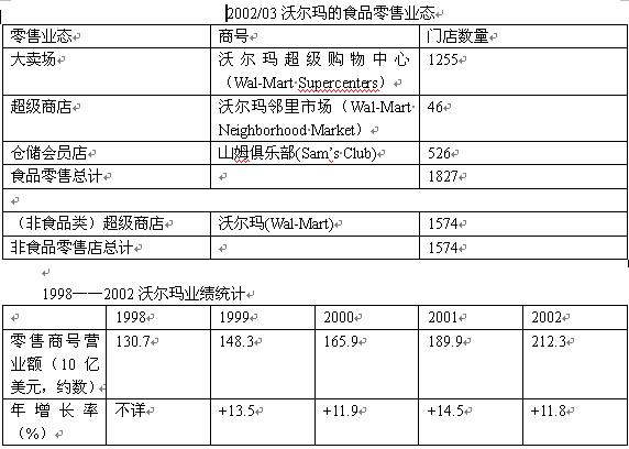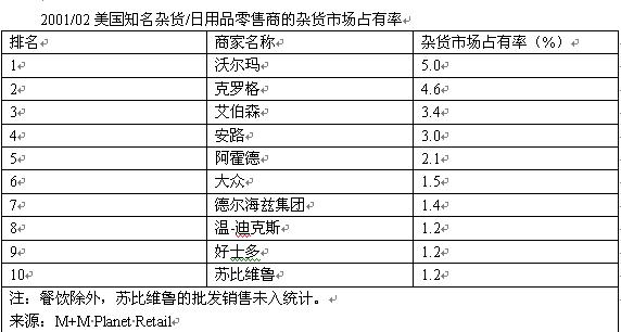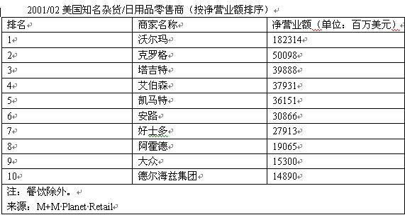 下表按照年凈營(yíng)業(yè)額大小次序列出了美國(guó)知名雜貨/日用品零售商。從中明顯可以看出,沃爾瑪?shù)男酆駥?shí)力遠(yuǎn)高于其他商家,其年?duì)I業(yè)額幾乎是離它最近的競(jìng)爭(zhēng)者克羅格的四倍。盡管塔吉特繼續(xù)保持高速度增長(zhǎng),但要接近沃爾瑪還有一段相當(dāng)長(zhǎng)的里程,而過去幾年艾伯森快速擴(kuò)大——這主要是1999年與American Stores合并的結(jié)果。位列第五的是凱馬特,該公司的同店銷售額和門店數(shù)量都在減少,目前正面臨著激烈的競(jìng)爭(zhēng)和財(cái)務(wù)困難。