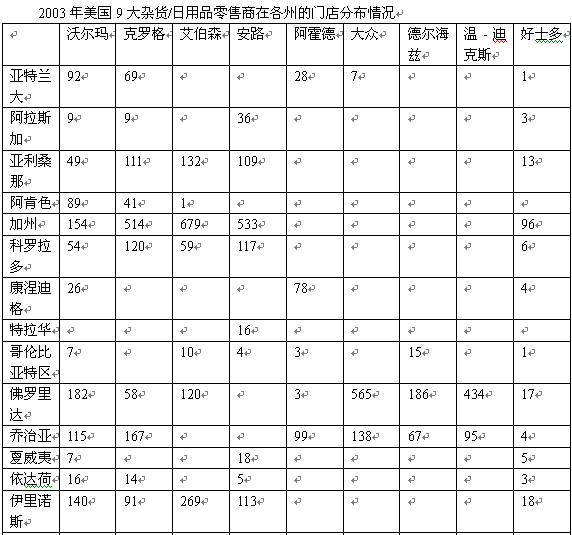 下表清楚的顯示了美國(guó)雜貨市場(chǎng)的高度不統(tǒng)一狀況。雖然美國(guó)被公認(rèn)為全球最發(fā)達(dá)、最現(xiàn)代、也是最成熟的食品零售市場(chǎng),無論是在地區(qū)層面,還是在全國(guó)層面,這里仍有很大的市場(chǎng)整合空間。五大商家只占有現(xiàn)代雜貨零售版塊食品銷售額中的18.1%,10大商家合在一起也只擁有23.9%的市場(chǎng)占有率。M+M Planet Retail在統(tǒng)計(jì)本表時(shí),計(jì)算了所有零售渠道如超級(jí)購(gòu)物中心、便利店、倉(cāng)儲(chǔ)會(huì)員店、現(xiàn)付自運(yùn)和藥店以及一般超市的雜貨銷售總額,因此表中所列市場(chǎng)占有率比單統(tǒng)計(jì)超市雜貨銷售額時(shí)要低。