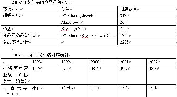 艾伯森是美國(guó)雜貨業(yè)和藥店領(lǐng)域的重要商家,既有專業(yè)的藥店和雜貨超級(jí)商店,也有大型食品和藥品聯(lián)合品牌店,其運(yùn)營(yíng)模式被許多對(duì)手模仿,但無論是在雜貨業(yè),還是在藥店領(lǐng)域,艾伯森的品牌影響力都非常強(qiáng)大。與American Stores合并后的一段時(shí)期里,艾伯森頗有些消化不良,不過經(jīng)過一系列的出售和改組,艾伯森的狀況明顯好轉(zhuǎn)。