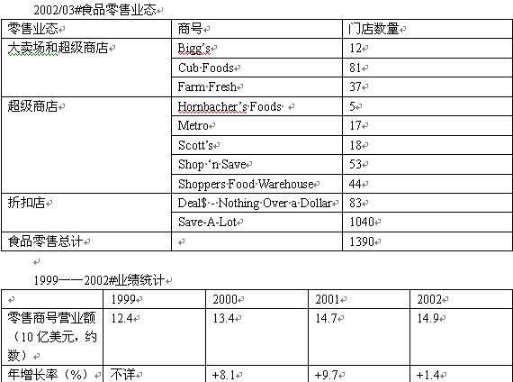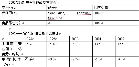 溫-迪克斯是一家地區(qū)性超級(jí)商店運(yùn)營(yíng)商,在佛羅里達(dá)、喬治亞和北卡羅萊那經(jīng)營(yíng)著Winn-Dixie, SaveRite和Thriftway三個(gè)商號(hào)。近年來,溫-迪克斯由于分散投資,業(yè)績(jī)有所下滑。目前,溫-迪克斯正忙于發(fā)展Winn-Dixie和SaveRite門店,前者迎合高檔消費(fèi)者,后者瞄準(zhǔn)的則是較為在意價(jià)格的顧客群體。