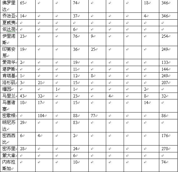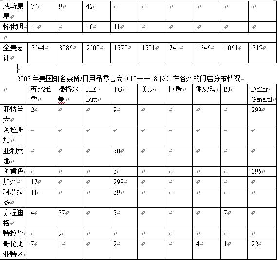 和許多國(guó)家的雜貨市場(chǎng)不同,美國(guó)食品零售業(yè)地區(qū)化程度很高,一些知名商家的全部銷售業(yè)績(jī)依賴的還不到五個(gè)州。例如,10大商家之一的大眾(Publix)有94%的門店分布在佛羅里達(dá)和喬治亞州,而排名第11的H.E. Butt在德克薩斯州以外地區(qū)只有一間門店。雖然如此,還是有幾個(gè)真正意義上的全國(guó)商家,其門店幾乎遍布各州。下表是18家最大的雜貨零售商的門店地理分布,里面列出了它們?cè)诿總(gè)州的門店數(shù)量。表一是九大商家的門店分布,表二則是第10到18名的商家的門店分布情況。
