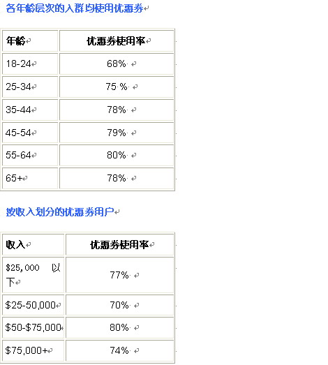 “值得注意的是,按教育程度來看,最大的優(yōu)惠券使用群是學(xué)歷最高的――研究生的優(yōu)惠券使用率為79%(大學(xué)生使用率為76%),”Brown說。 “這進(jìn)一步說明,所有不同人口群體的消費(fèi)者,包括稿收入者和高學(xué)歷者在內(nèi),均意識(shí)到使用優(yōu)惠券的好處,因此,優(yōu)惠券成為任何尋求實(shí)現(xiàn)其業(yè)務(wù)目標(biāo)的企業(yè)的一個(gè)理想的促銷戰(zhàn)術(shù)!