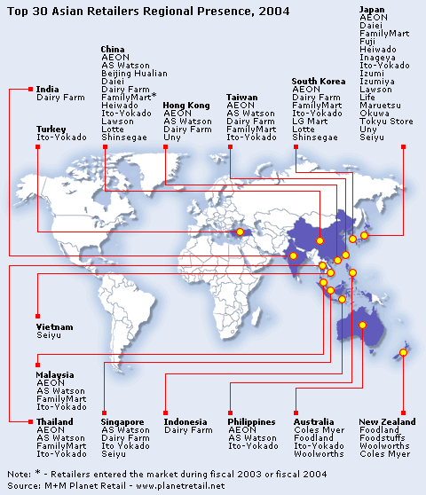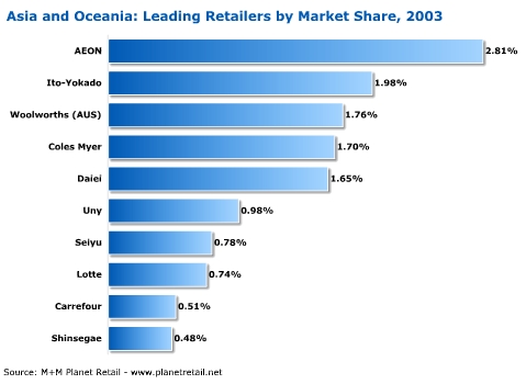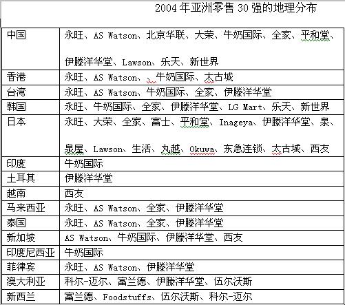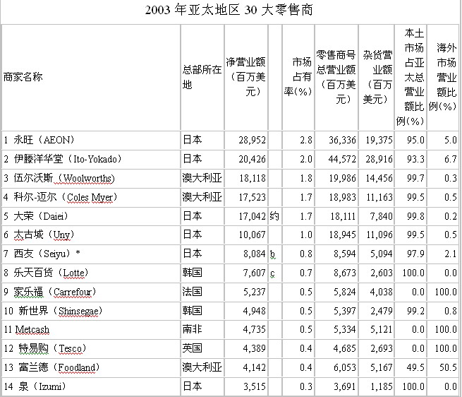 注: * 沃爾瑪持有日本西友公司37.8%的股份,但卻未將西友公司合并入賬。b – 10個(gè)月交易期。c – 凈營(yíng)業(yè)額中合并統(tǒng)計(jì)了樂天百貨公司(樂天百貨店、Lotte Mart、Lotte Super、LotteShopping.com、樂天影院)、Korea Seven和Lotteria Co Ltd.的業(yè)績(jī)。來(lái)源: M+M Planet Retail - www.planetretail.net 2003年亞太地區(qū)知名零售商(按市場(chǎng)份額排序)