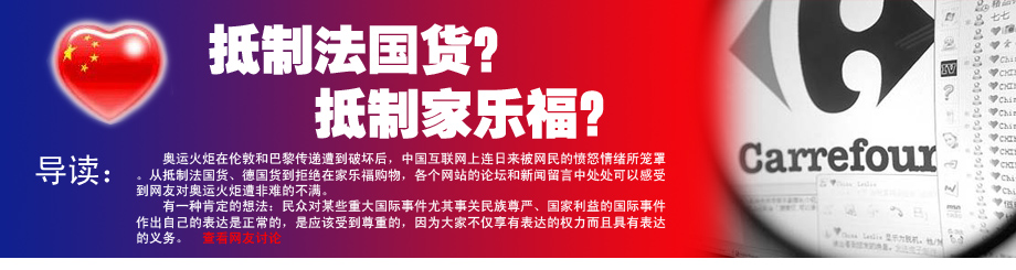 因?yàn)榘屠璋l(fā)生的干擾奧運(yùn)火炬?zhèn)鬟f事件,網(wǎng)絡(luò)上紛紛號(hào)召中國(guó)民眾抵制法國(guó)商品,特別是抵制家樂(lè)福,理由是家樂(lè)福大股東涉嫌捐巨資給達(dá)賴(lài),支持‘藏獨(dú)’。
